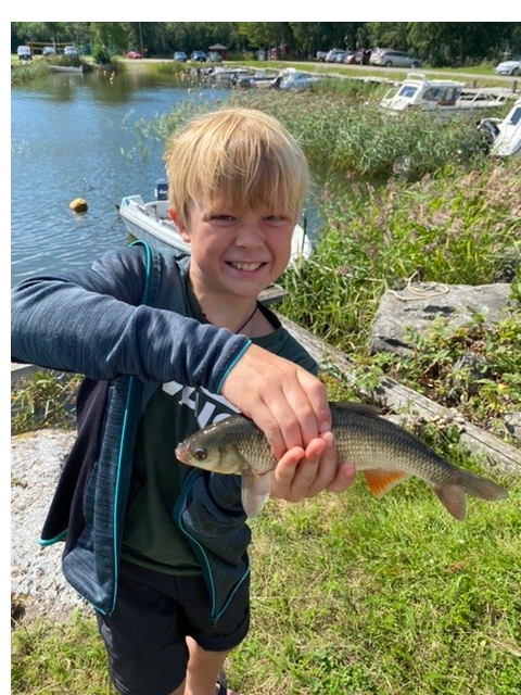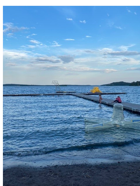 Comme un peu partout en Finlande, il y a un ponton, une petite plage, un terrain de volley, une cabane avec bbq, des toilettes sèches, des vestiaires, des jeux pour enfant... En revanche, quand on voit la couleur de la rivière on se dit que pas grand monde ne doit piquer une tête ici. C'était sans compter sur les finlandais qui se baignent un peu partout... Des familles sont d'ailleurs arrivées peu après et ont plongé sans hésitation dans cette belle rivière marron sous l'œil dubitatif de Mathis 😃